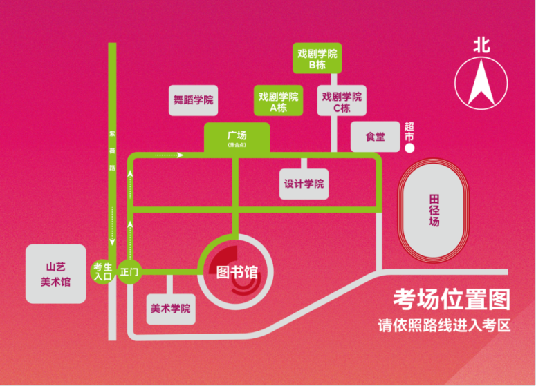 2.地點:山東藝術(shù)學(xué)院長清校區(qū)戲劇學(xué)院樓(濟(jì)南市長清區(qū)大學(xué)科技園紫薇路6000號)??忌殢纳綎|藝術(shù)學(xué)院美術(shù)館大門(山東藝術(shù)學(xué)院長清校區(qū)西門對面)進(jìn)入,乘坐大巴直接前往考區(qū),考點不再安排考生提前進(jìn)校查看考場,考場示意圖如下所示。